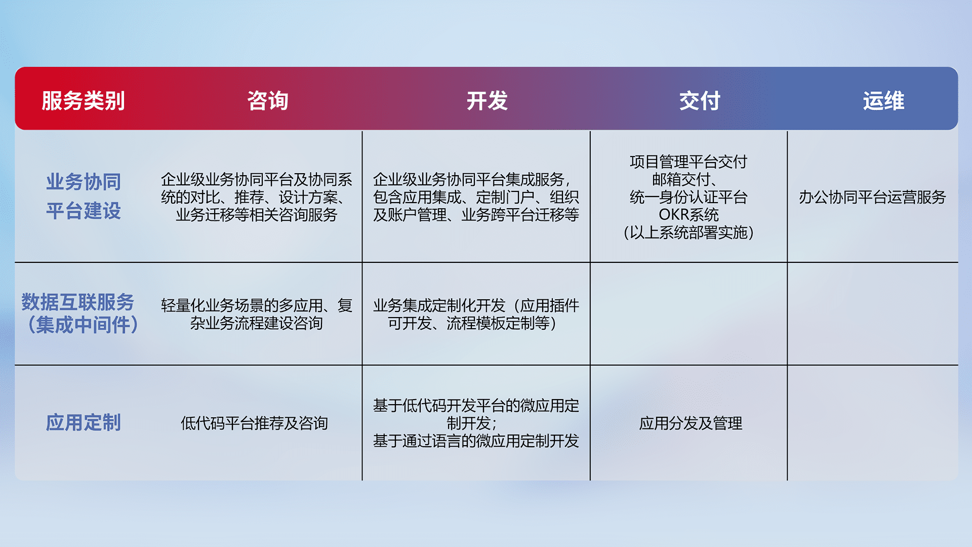 针对钉钉、、企微、、、、IDaas等平台级产品提供产品的规划、、、、方案、、、、交付、、、定制化开发等服务,,,,实现如统一协同办公、、、、智能客户服务、、混合会议管理、、、、智能数据查询、、、等业务场景,,,实现数字化转型。。