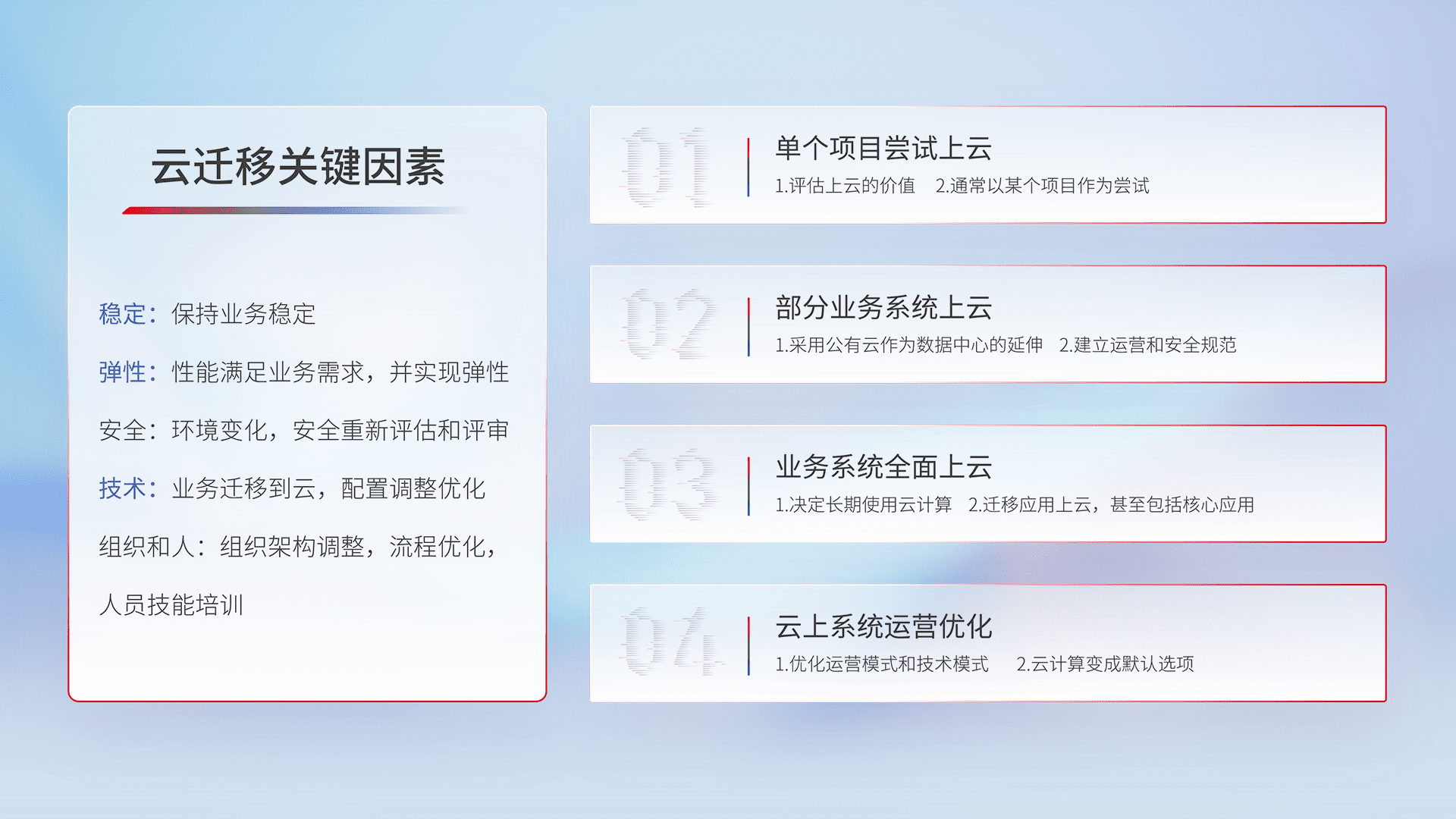 结合实际业务,,,,从规划设计、、、、云平台选型、、、、云原生改造、、、数据迁移、、集成交付,,迁移全过程为客户识别最佳上云路径,,,做好风险识别管理,,设计网络架构、、身份权限、、、安全审计合规、、、操作审计、、、、日志审计、、、、监控告警策略、、、、多站点容灾设计等,,,,对云上基础设施进行整体规划,,,,提升IT治理水平,,,,以满足弹性、、、高可用、、、高性能的需求。。