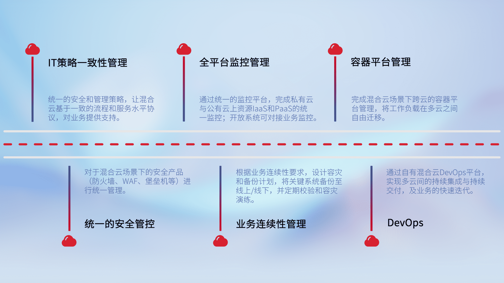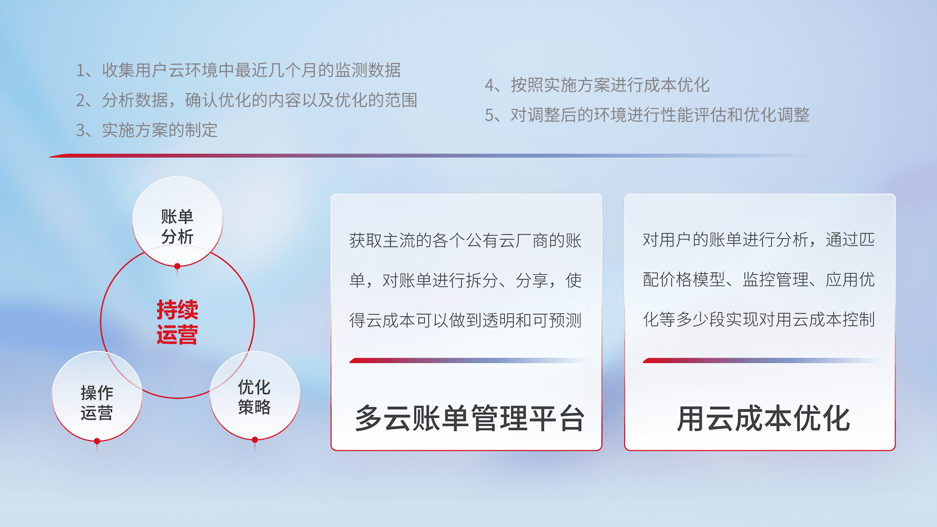 通过多云纳管,,以统一的资源数据模型把客户的云资源进行抽象和封装,,,进而实现对多云资源的统一操作,,,,保障云资源管理的可靠性、、、、稳定性与可用性。。。量身定制化运维内容,,配置、、开发运维、、、、补丁管理、、备份、、、、监控、、、认证和访问管理、、、审计和日常巡检等,,保障在用云过程中的可靠度,,,,稳定度以及高可用率。。。。