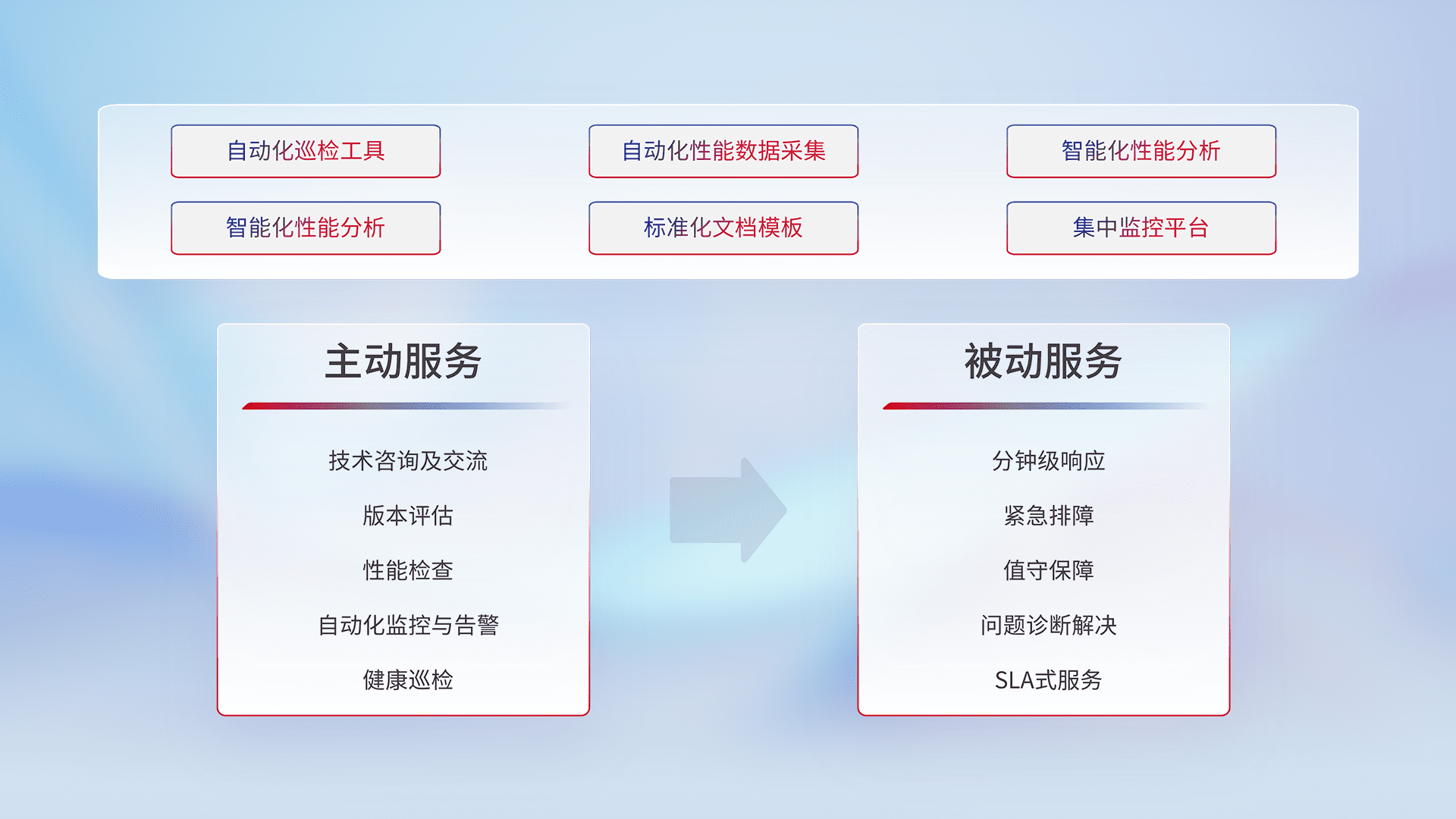 智能化工具和标准化文档,,,,保障服务质量,,,提供主动服务(包含技术咨询、、、版本评估、、、、性能检查、、、、自动化监控与告警、、、、健康巡检)和被动服务包含(分钟级响应、、、紧急排障、、值守保障、、、、问题诊断解决、、SLA服务)。。。